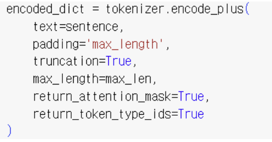 - 텍스트 데이터를 BERT에 필요한 입력 형태로 변환 → 함수의 결과 값