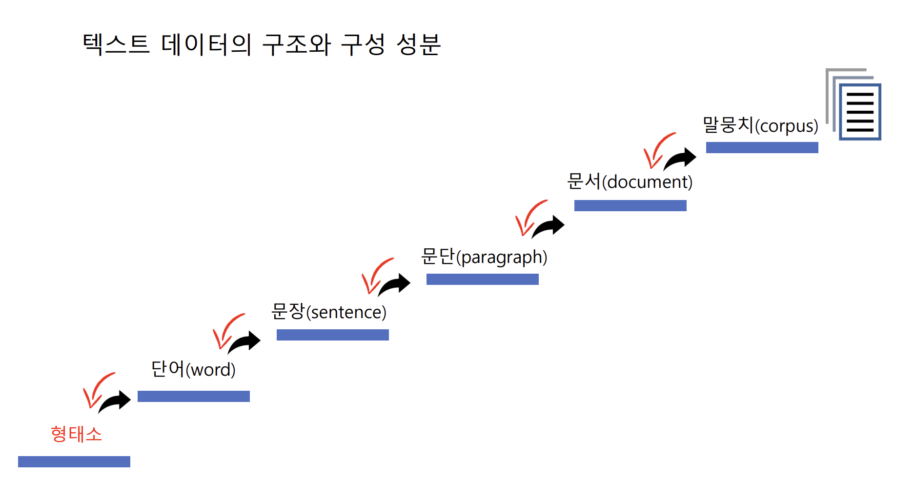 - 9품사-조사를 제외하고 혼자 쓰일 수 있는 단어로 취급 (형식형태소(조사, 어미, 접사) == 불용어), 한글을 토큰화하기 위해서는 품사,단어 보다 작은 단위인 형태소 단위로 분할 해야함 > 형태소 분석기 등 활용