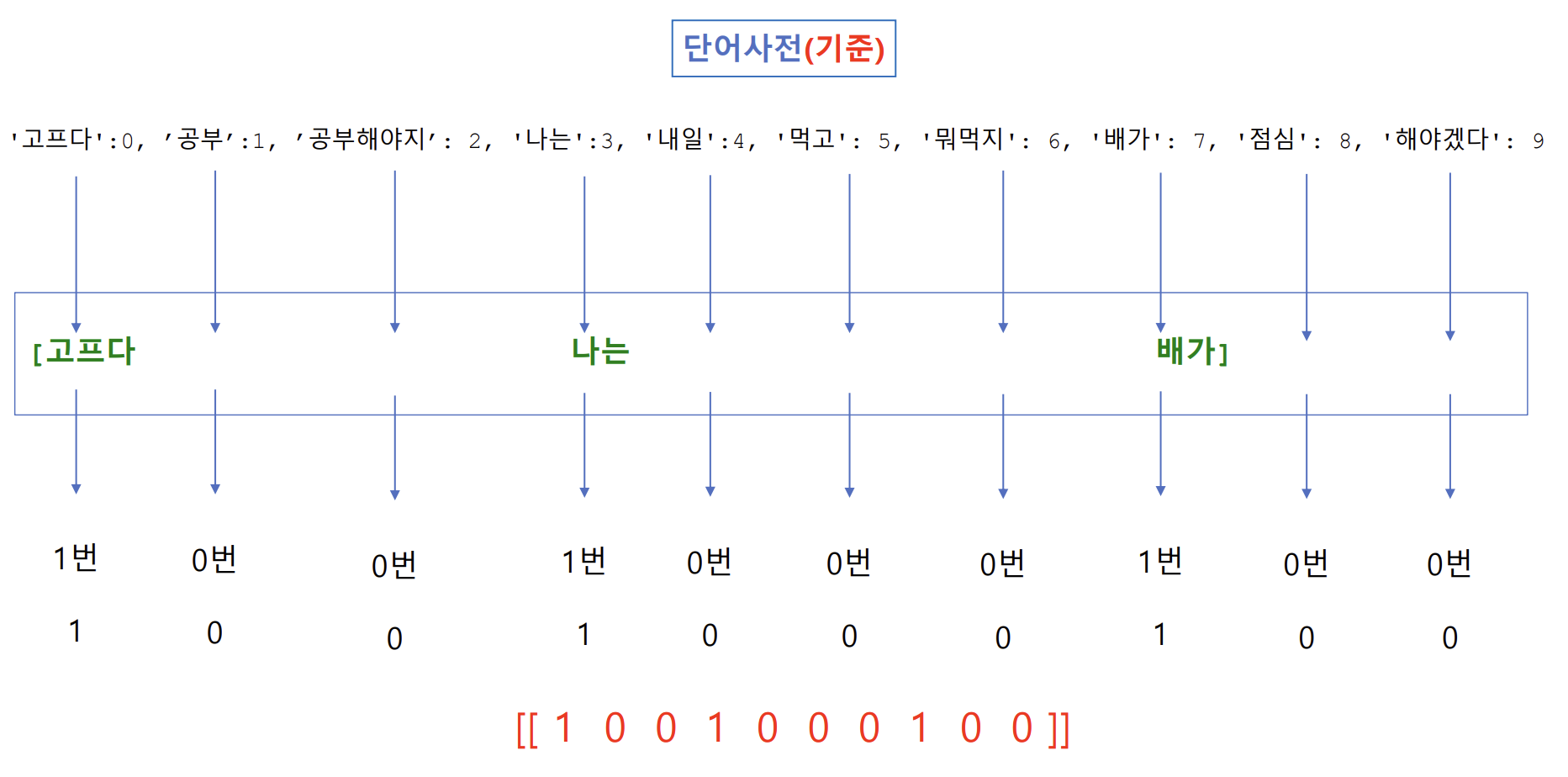예) 나는 배가 고프다 → [ 1 0 0 1 0 0 0 1 0 0 ]- BoW(Bag of Words)