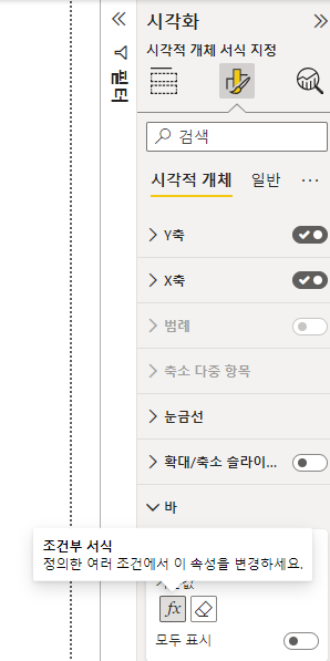 시각화 탭 > 바 > 조건부 서식 클릭