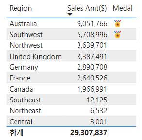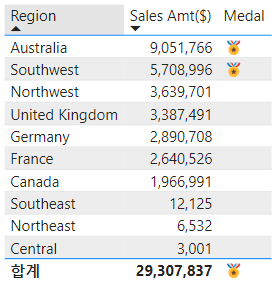 매출이 5,000,000 이상인 지역은 메달 아이콘 부여하도록 계산식을 추가