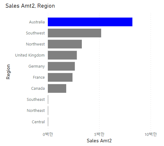매출 1위인 지역만 "Blue"로 표시되고, 그 외 지역은 "Grey"로 표시되도록 함