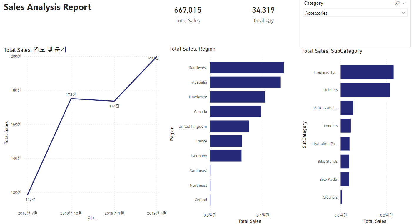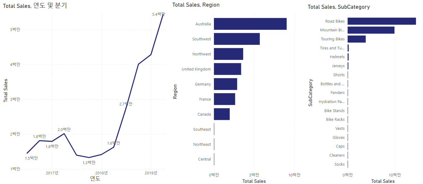 꺾은선 그래프, 바 그래프를 활용하여 연도/분기별, 지역, 서브카테고리별 Total Sales 시각화