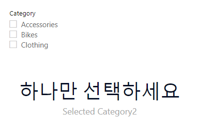 Selected Category2 = SELECTEDVALUE(Products[Category],"하나만 선택하세요")