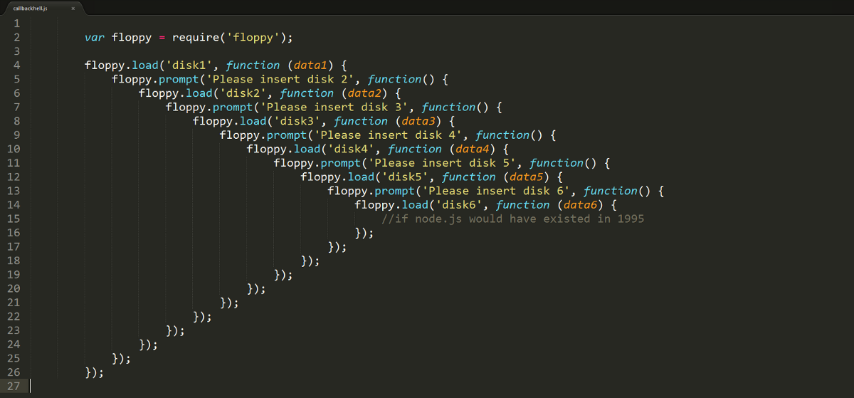 참고로 비동기식 처리의 순서를 보장하기 위해서는 콜백 함수를 활용 해야하는데 수가 너무 많으면 아래처럼 콜백지옥에 빠진다고 한다...