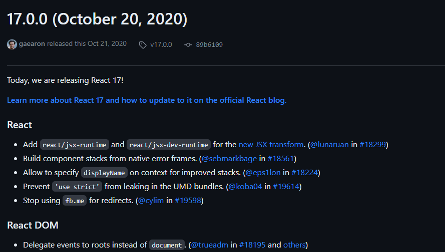 리액트 17 이전까지는 document 수준으로 이벤트를 위임하지만, 그 이후는 리액트 루트수준(대개 div id=”root” 의 형태일 것이다.)으로 이벤트를 위임한다.