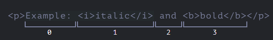 지금은 Example: <i>italic</i> 를 select 해보자. (text node를 포함하면) p태그의 0번째, 1번째 자식이다.