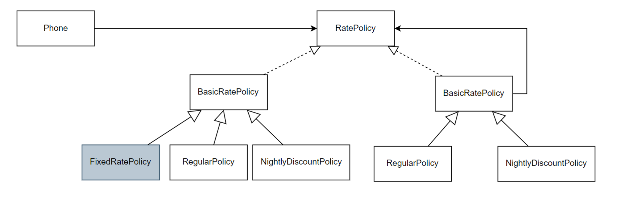 상속 기반 설계에서는 새 부가 정책 추가를 위해 상속 계층에 필요 이상의 클래스를 추가해야 했다. 합성 기반 설계에서는 이 변경을 간단히 반영할 수 있다. 이를테면 고정 요금제가 필요할 경우 고정 요금제를 구현한 클래스 ‘하나’만 추가한 후 원하는 방식으로 조합하면 된다.