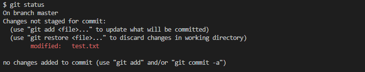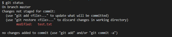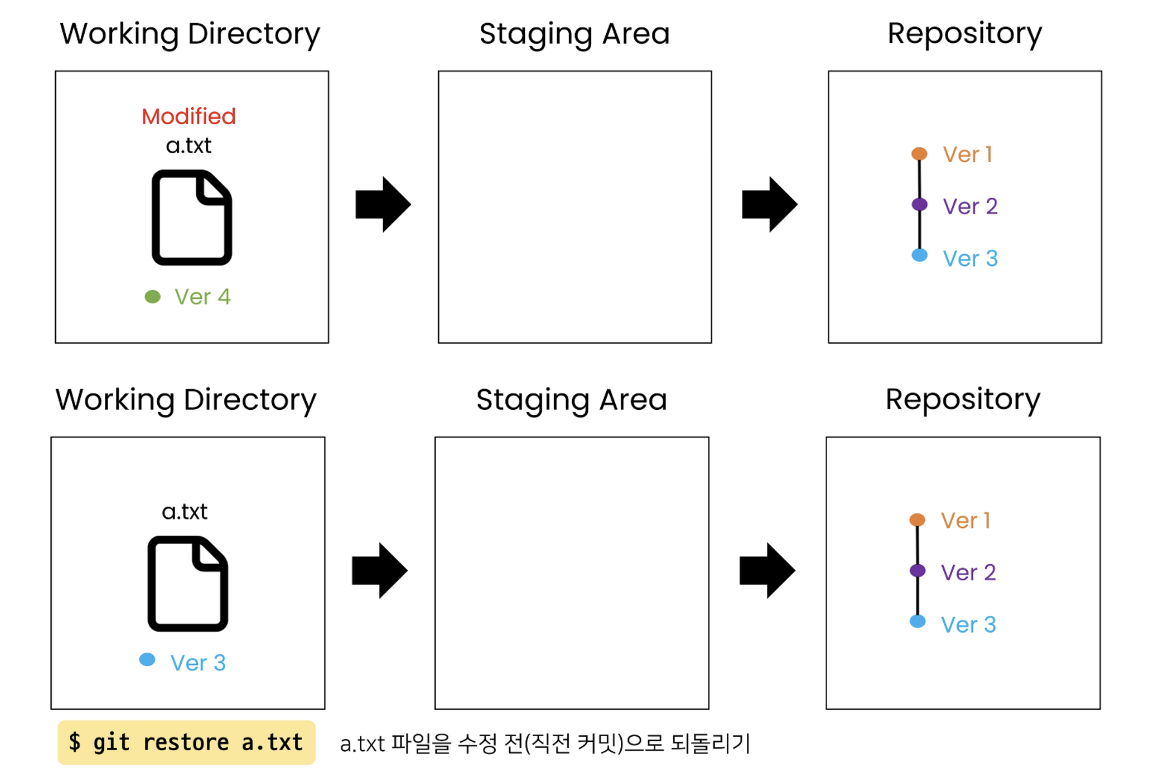 git restore {파일 이름} 명령어를 통해 수정 전(직전 커밋)으로 되돌아 갈 수 있다.$ git restore test.txt