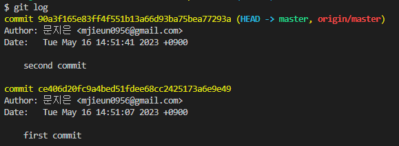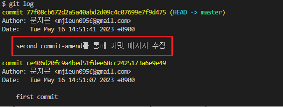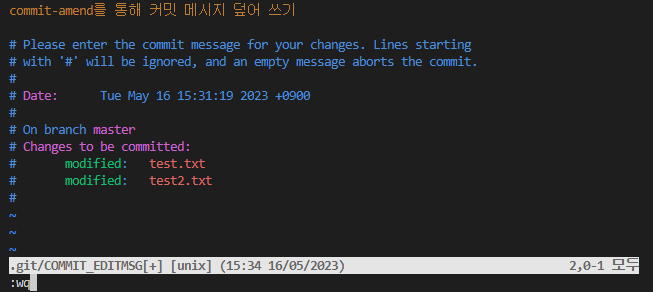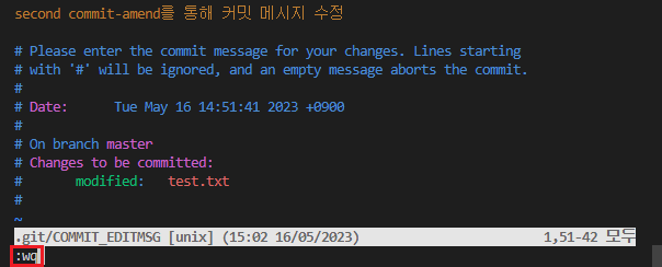 git commit --amend 명령어를 통해 직전 커밋 메세지를 수정할 수 있다.i를 눌러 입력 모드로 변경하고 커밋 메시지 수정esc를 눌러 명령모드로 변경하고 :wq 입력 후 엔터를 누르면 커밋메세지가 저장된다.