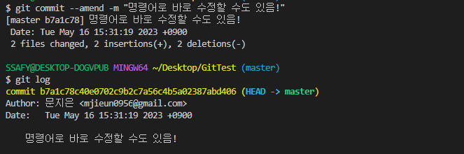 $ git commit --amend -m {커밋 메시지} 명령어로 바로 메시지를 수정할 수도 있다.