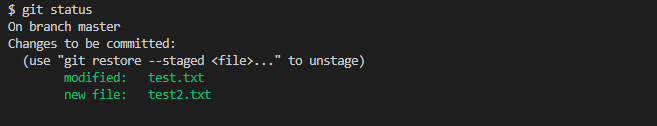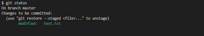git restore --staged {파일 이름} 명령어를 통해 Working Directory로 되돌릴 수 있음 (Unstaged == add 취소)$ git restore --staged test.txt