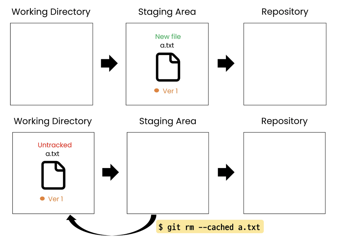 git rm --cached {파일 이름} 명령어를 통해 Working Directory로 되돌릴 수 있음 (Unstaged == add 취소)$ git rm --cached test.txt