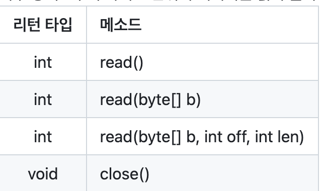 - 외부 장치로부터 바이트 단위의 데이터를 읽어 올 수 있는 read() 추상 메소드가 정의되어 있다.