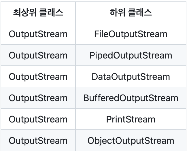 - OutputStream을 상속받는 클래스들은 접미사로 OutputStream이 붙는다.