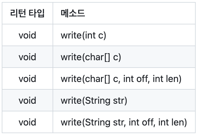 - 문자 단위의 데이터를 외부 장치에 기록할 수 있는 write() 추상 메소드가 정의되어 있다.