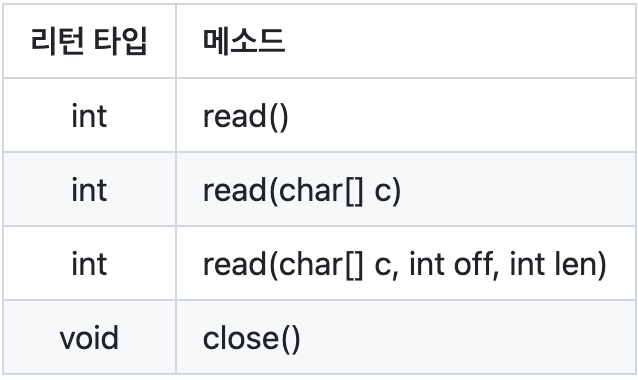 - 외부 장치로부터 문자 단위의 데이터를 읽어 올 수 있는 read() 추상 메소드가 정의되어 있다.