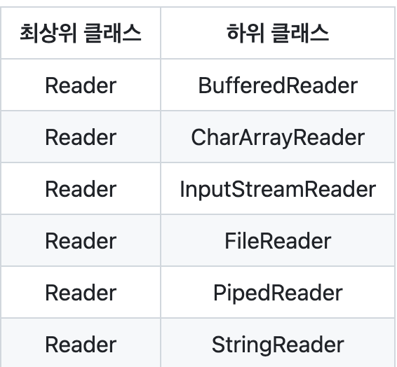 - Reader를 상속받는 클래스들은 접미사로 Reader가 붙는다.