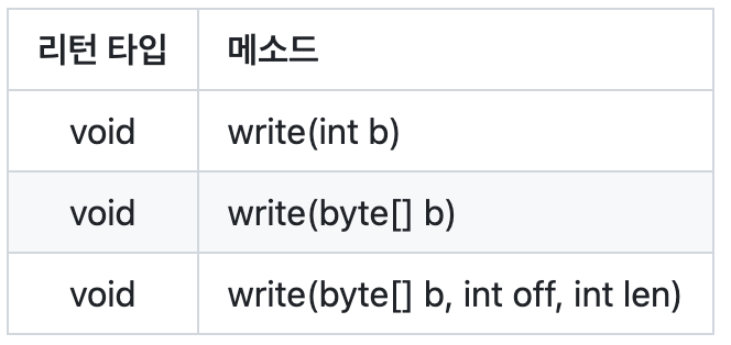 - 바이트 단위의 데이터를 외부 장치에 기록할 수 있는 write() 추상 메소드가 정의되어 있다.