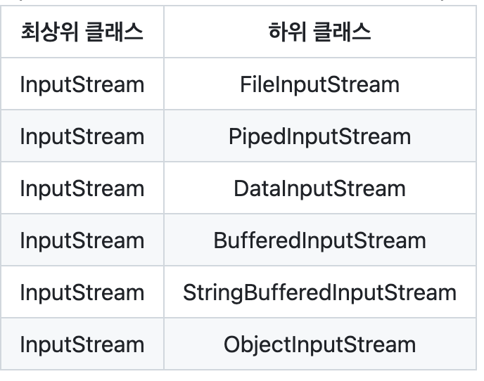 - InputStream을 상속받는 클래스들은 접미사로 InputStream이 붙는다.