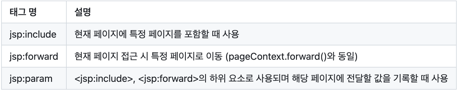 - JSP 페이지에서 자바 코드를 직접 입력하지 않고 특정 작업을 수행하는데 사용하는 태그이다.
