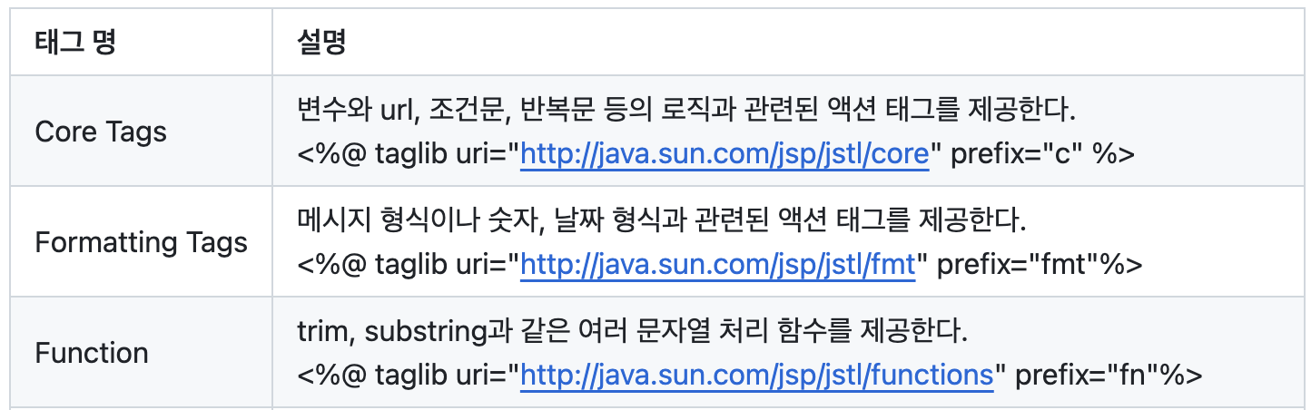 - JSP 페이지에서 자주 사용하는 코드들을 사용하기 쉽게 태그로 만들어 표준으로 제공한다.