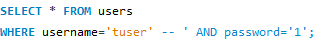 SELECT * FROM users WHERE username = 'admin' --' AND password = '';