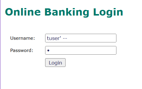 실제 존재하는 아이디(tuser) 뒤에 ' -- 를 입력시, SQL 문법에서 다음과 같이 된다.