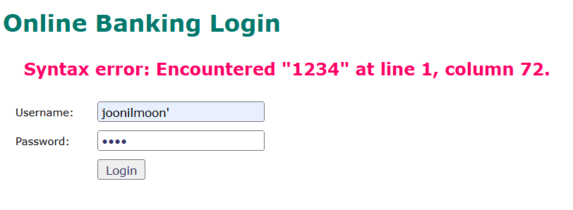 가입한적 없는 내 이름을 넣으면 당연히 다음과 같이 로그인 실패 문구가 뜬다. 그럼 내 이름(username)에 '를 추가하면 어떻게 될까?