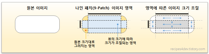 파일의 확장자를 포함한 이름의 마지막이 ".9.png"로 끝나면, 안드로이드에서는 이를 나인 패치(9-Patch) 이미지 파일로 인식하여 처리