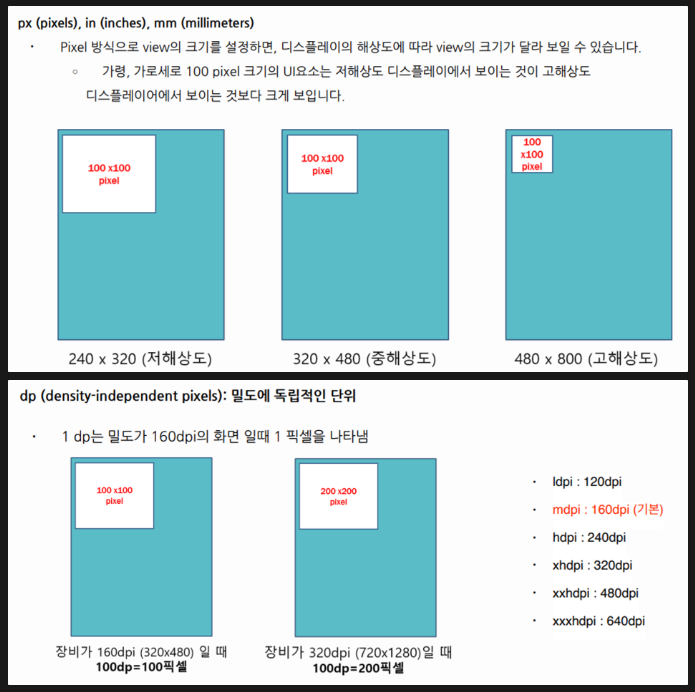 디스플레이의 해상도(밀도)와 상관 없이 다룰 수 있는단위dp(Density-independentPixel)를