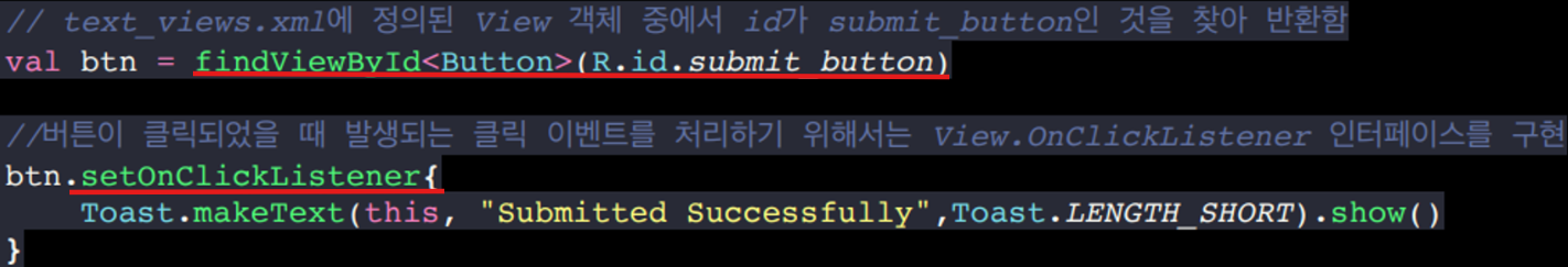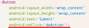 > 버튼 위젯의 onClick속성 활용 : 버튼이 속해있는 Activity에서 클릭시 실행될 매소드를 만들고 버튼의onClick()속성에 해당 매소드 추가