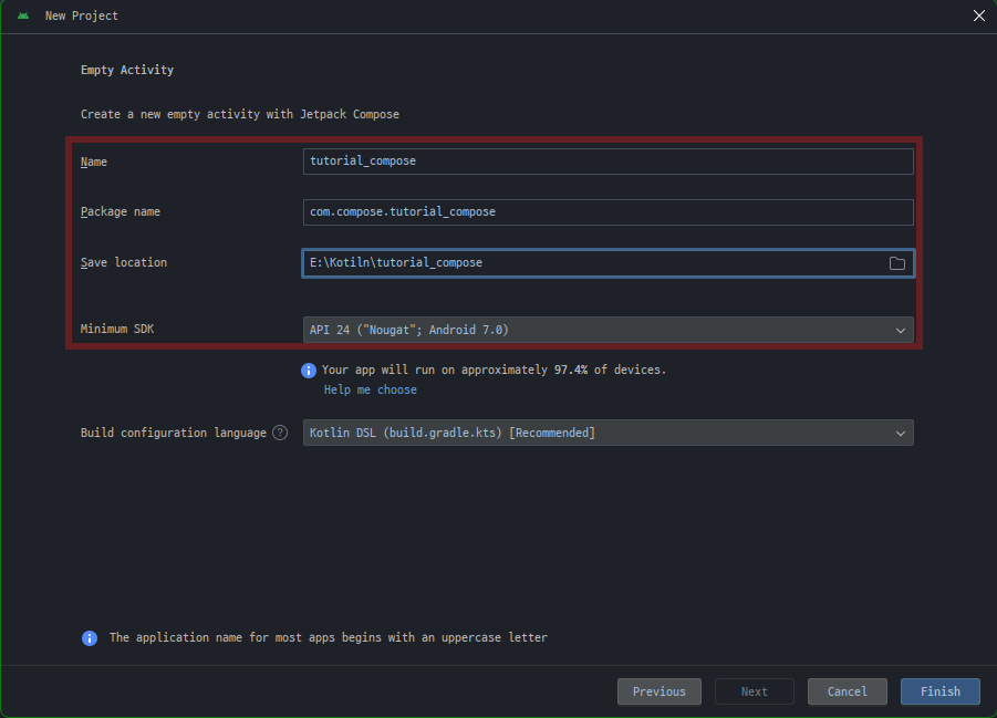 ( Language 드롭다운 메뉴에서는 Kotlin 옵션만 사용할 수 있음.