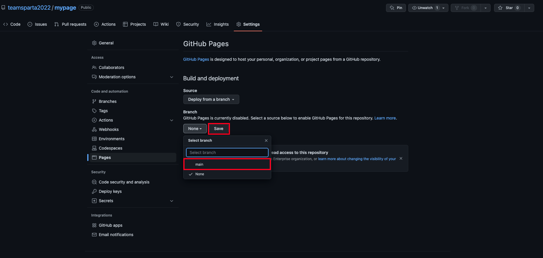 Branch Name을 main으로 설정하고 save 버튼을 누릅니다