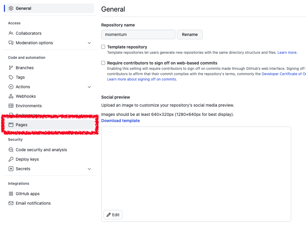settings 화면 왼쪽부분에서 Pages를 찾아 클릭합니다