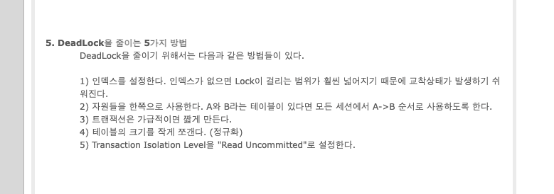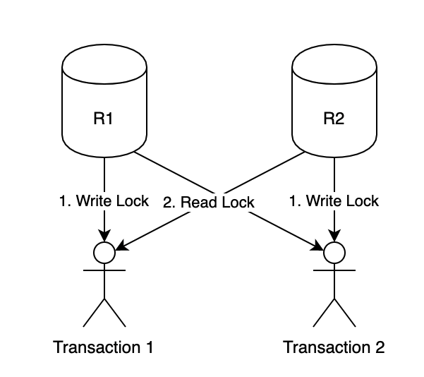 데드락은 트랜잭션간 교착상태를 의미하며 두 개의 트랜잭션간에 각각의 트랜잭션이 가지고 있는 리소스의 Lock을 획득하려할때 발생
