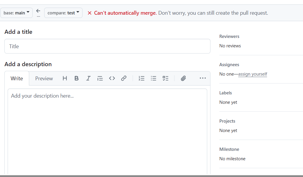 위의 이미지와 같이 병합을 할 순 없지만 pr은 할 수 있다고 뜬다