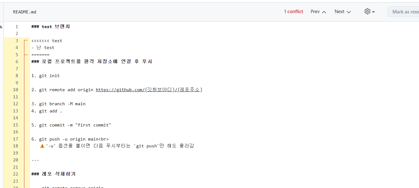 pr버튼을 누르면 서로 충돌이 나는 파일을 보여주는데 내가 남기고 싶은 브랜치 내용을 남기고 업로드하면 된다