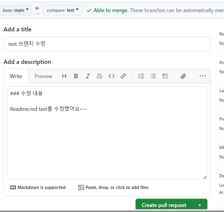 PR이라고도 부르며 간단한 메시지를 작성할 수 있다 pr 사용해보기