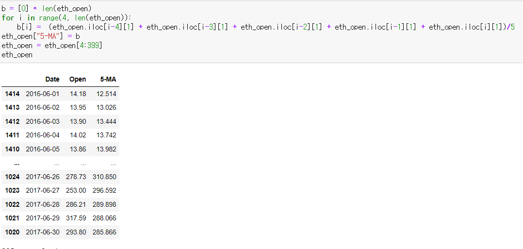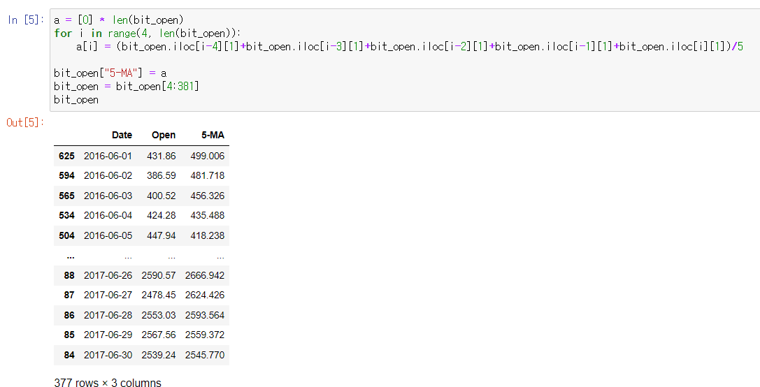 bit_open의 Open값을 바탕으로 5-MA를 구하여 df에 추가하였다.