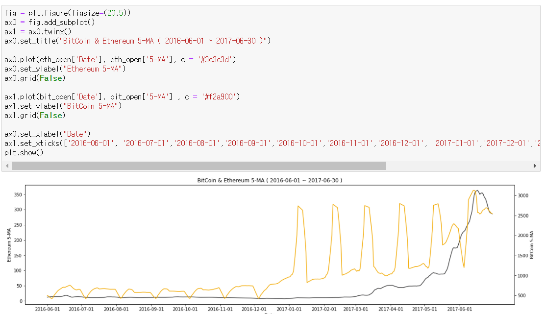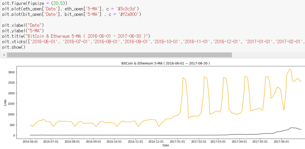 Bitcoin 과 Etheruem의 5-MA를 구하고 시각화하는 실습을 진행해보았다.