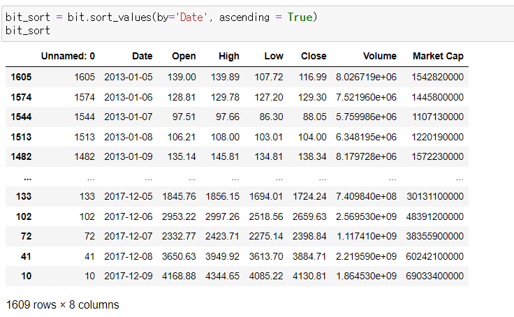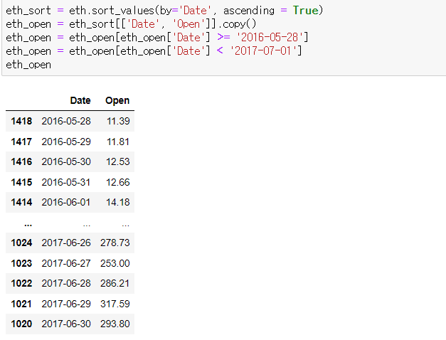 그리고 기존의 dataframe은 날짜 정렬이 되어있지 않기 때문에 .sort_values()를 통해 정렬된 새로운 dataframe을 만들었다.