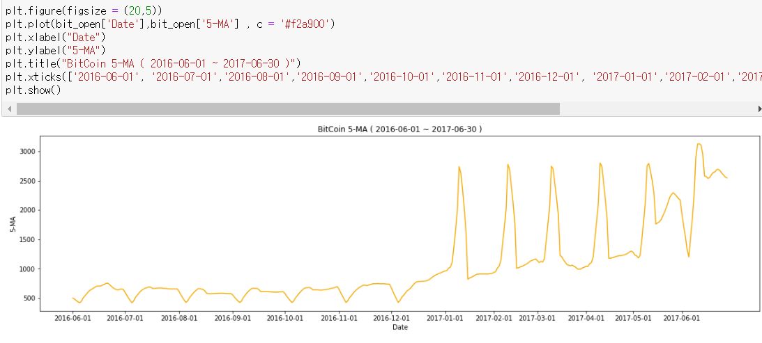 Kaggle의 BitCoin.csv를 바탕으로 2016.6 ~ 2017.6 기간의 5-MA(Moving Average) 비트코인 가격 그래프를 그려보자!