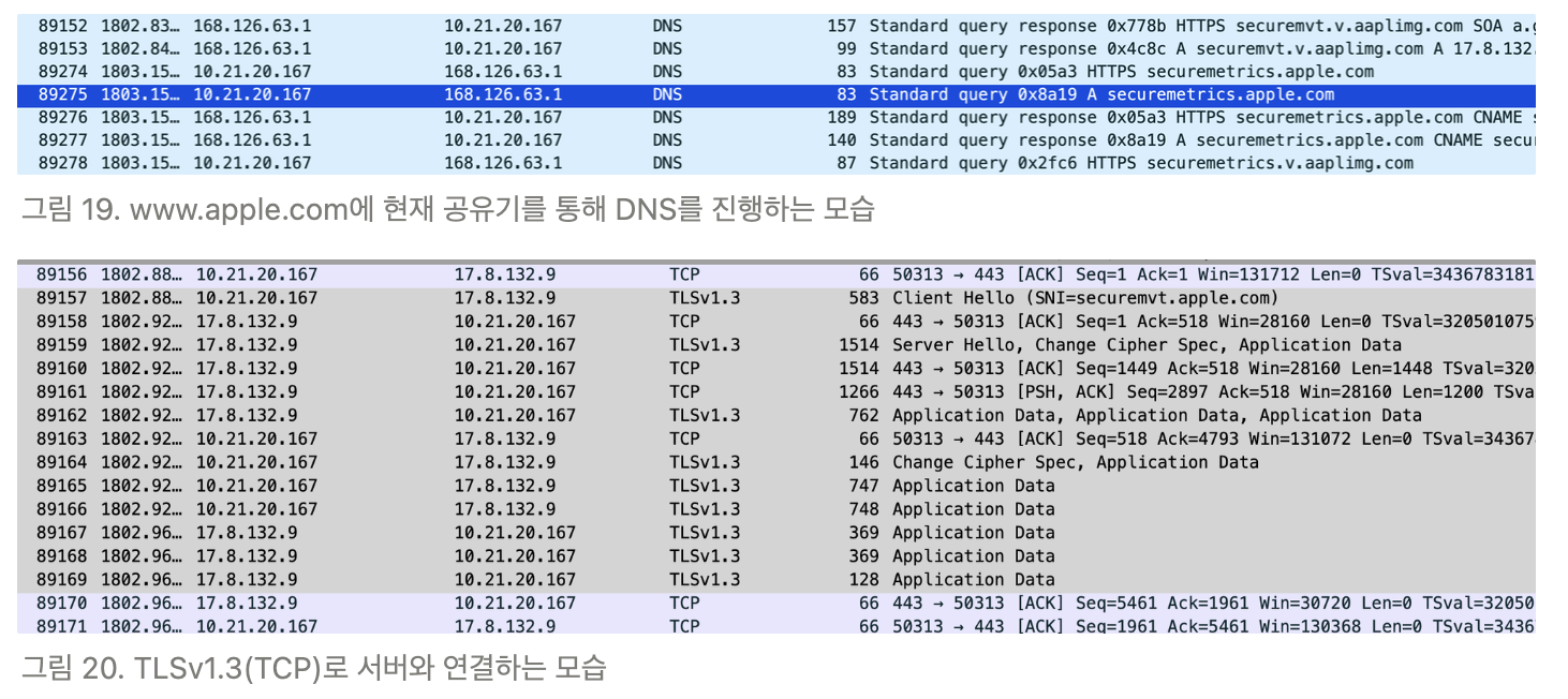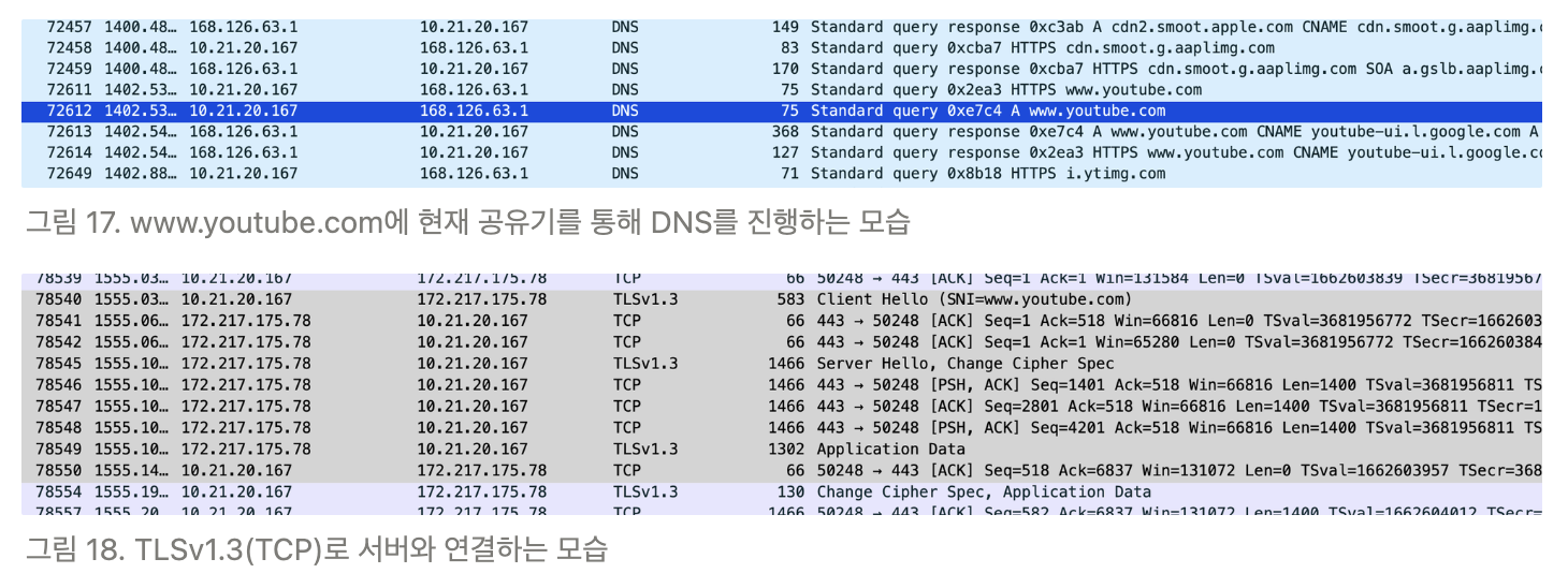 그 후 DNS로 연결된 뒤에 TLSv1.3(TCP)로 서버와 연결하는 모습을 확인해본다.
