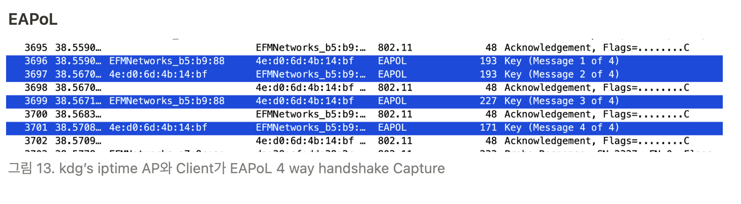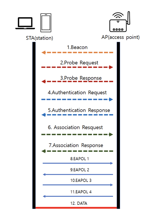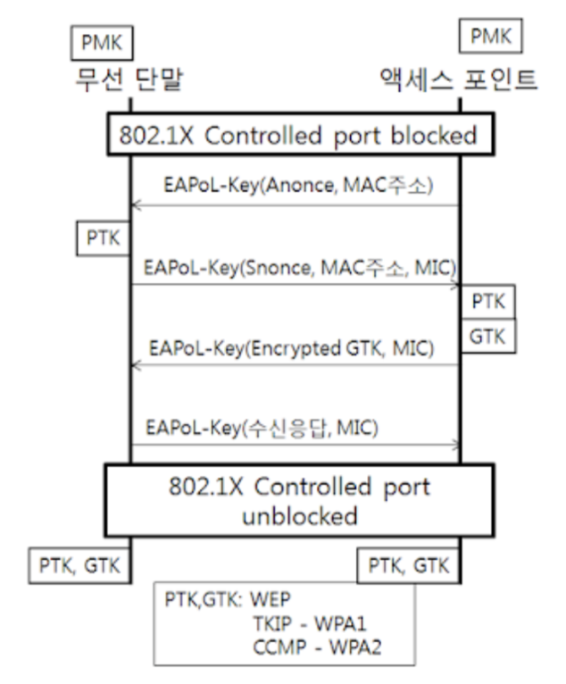 이는 AP와 Client 간에 4개의 메세지를 교환하며 무선 매체를 통해 전송된 실제 데이터를 암호화하는 데 사용할 수 있는 암호화 키를 생성하고 분배하는 과정이다.