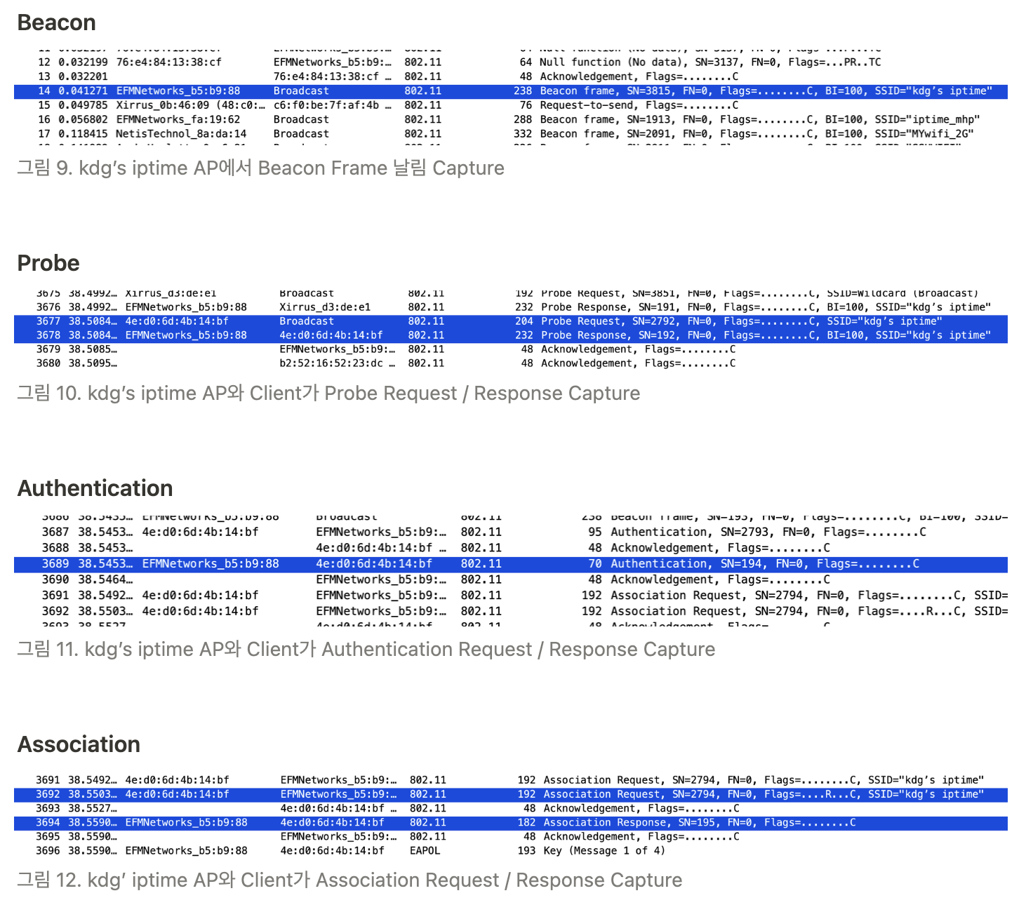 이러한 과정을 통해 클라이언트는 Probe Response를 기반으로 가장 적합한 네트워크를 선택하여 연결하게 된다. 추가적으로 클라이언트는 AP에 접속되어 있어도 주기적으로 Probe Request를 발생시킨다