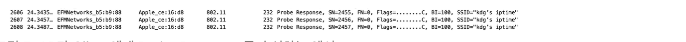 그 뒤 AP가 클라이언트 장치가 보낸 Probe Request를 수신하게 된다. 그에 맞춰 해당 네트워크에 대한 정보를 포함한 Probe Response를 반환한다. 아래 그림은 Probe Response를 보낸 예시이다.
