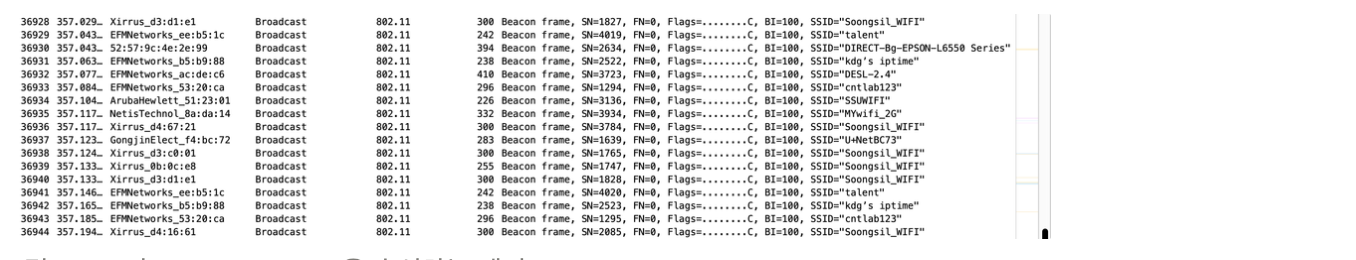 AP가 송신하는 거리 안에 있으면 초 단위로 계속해서 Beacon Frame을 Capture 하는 것을 알 수 있다. 이를 통해 Client가 네트워크를 발견하고 연결할 수 있게끔 해준다.