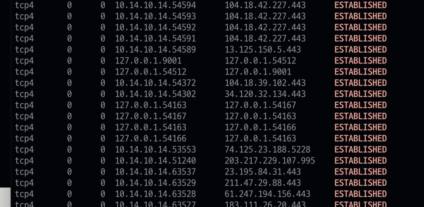 # 현재 다른 시스템과 연결된 상태(Established)인 모든 포트 정보를 조회